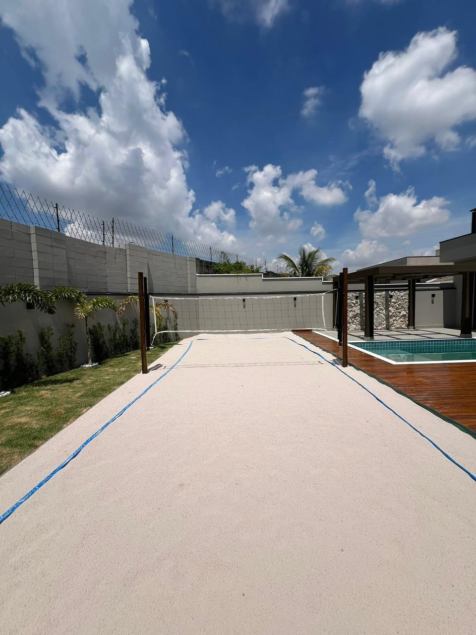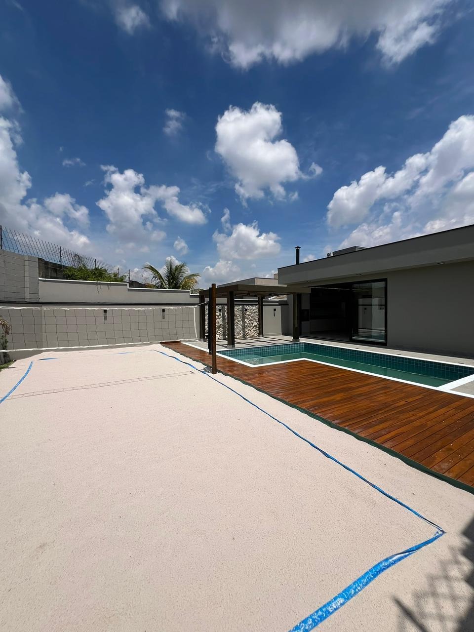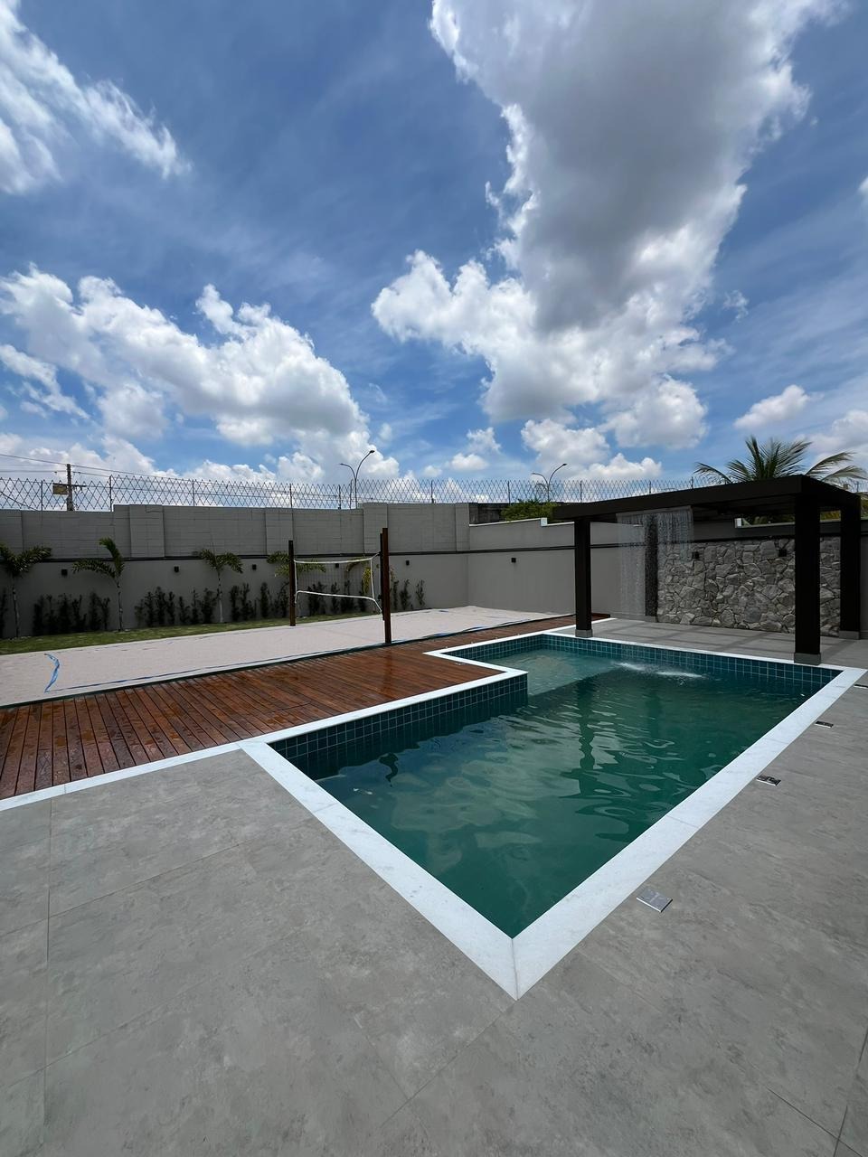 No lazer, um amplo quintal com piscina com hidro e cascata, preparada para aquecimento solar 🏊‍♂️☀️, pergolado, jardim 🌿 e quadra de beach tennis exclusiva.
