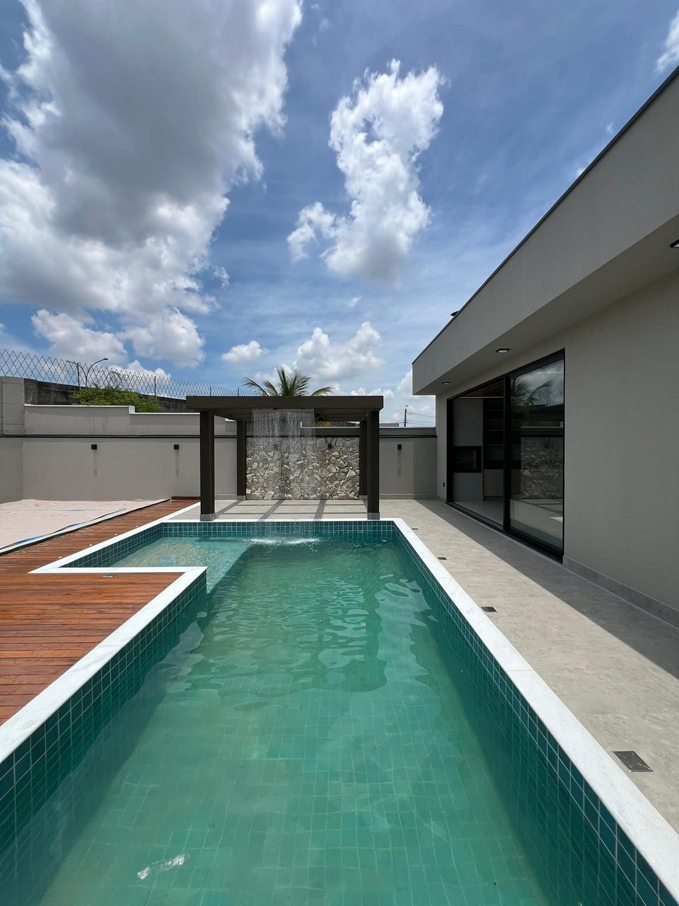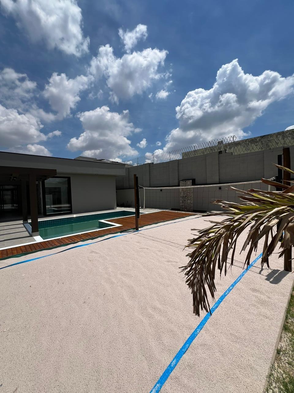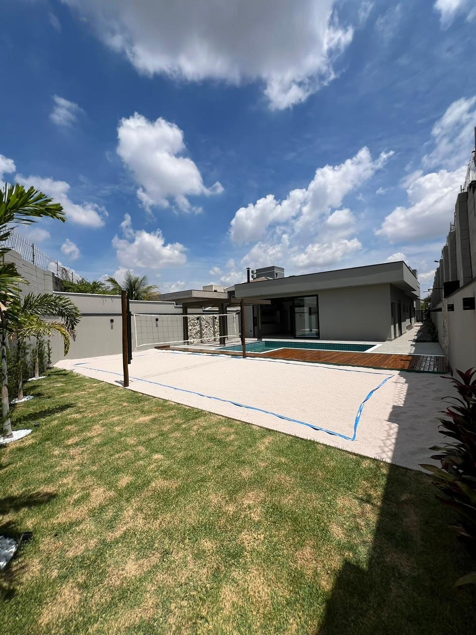 No lazer, um amplo quintal com piscina com hidro e cascata, preparada para aquecimento solar 🏊‍♂️☀️, pergolado, jardim 🌿 e quadra de beach tennis exclusiva.