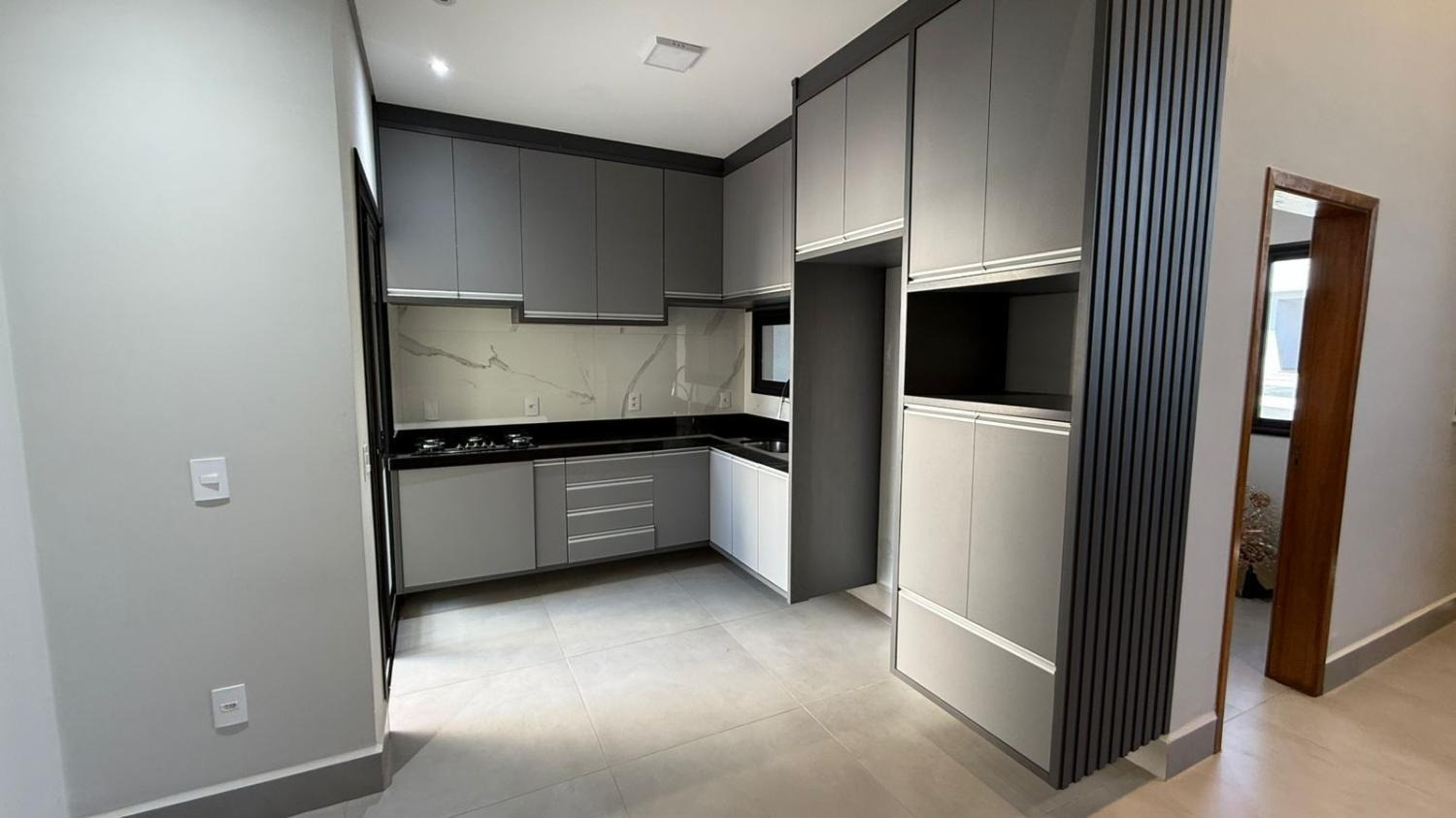 O imóvel conta com 3 quartos, sendo uma suíte com closet, além de um escritório, sala, cozinha, lavanderia e área gourmet integrada à piscina. Os quartos possuem esquadrias em alumínio preto, automatizadas com controle remoto, garantindo praticidade e modernidade.